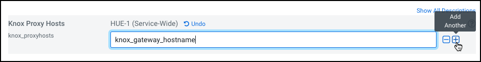 - When integrating Hue with Knox, it is essential to deploy a Hue Load Balancer. After deployment, specify the Load Balancer hostname in the Knox Proxy Hosts field by clicking the + icon.