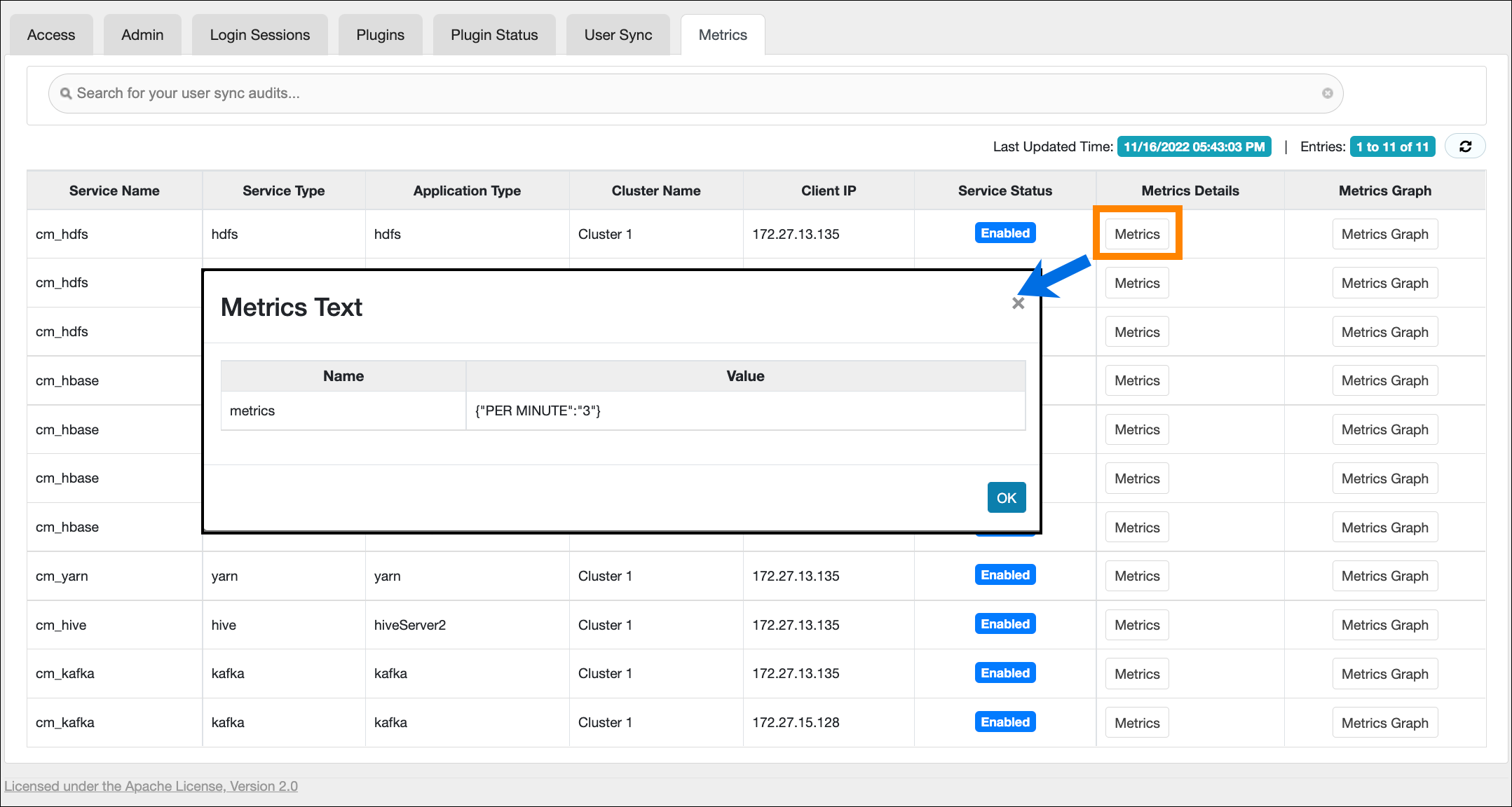 Ranger. Ranger captures audit metrics throughput from the following Ranger