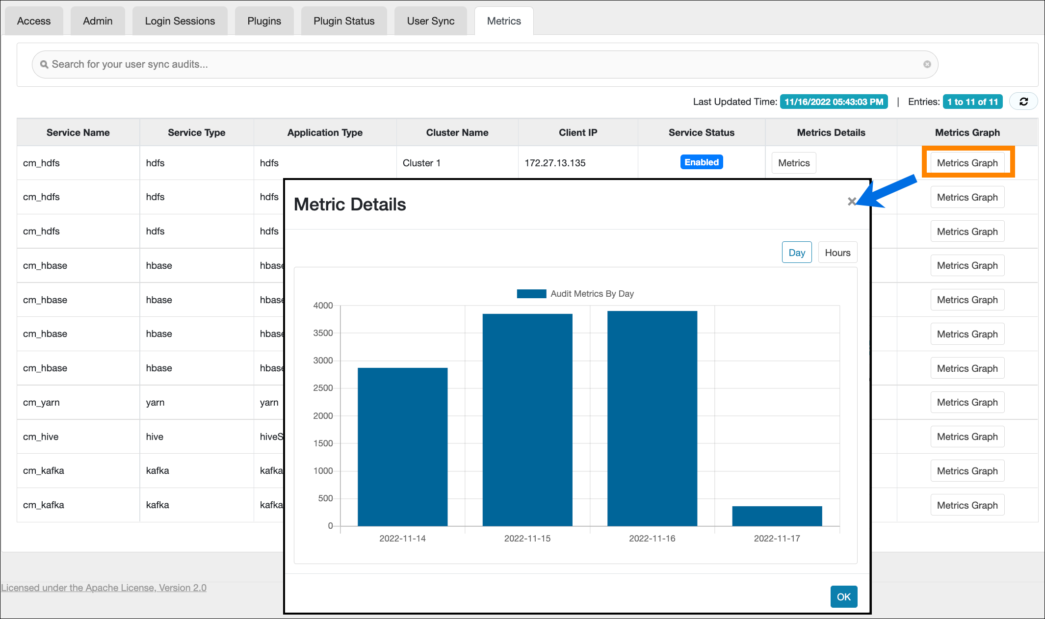How to view audit metrics information using the Ranger Admin Web UI.