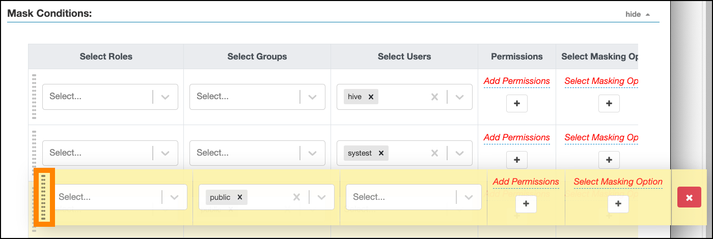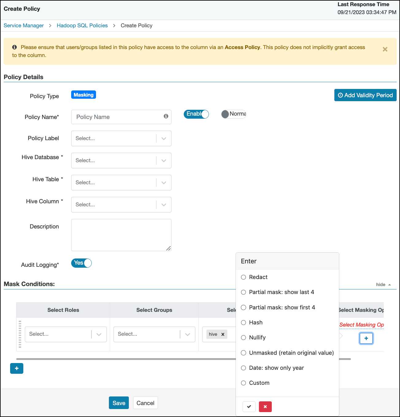 Dynamic column masking policies are similar to other Ranger access policies for Hive. You can set filters for specific users, groups, and conditions. With dynamic column-level masking, sensitive information never leaves Hive, and no changes are required at the consuming application or the Hive layer. There is also no need to produce additional protected duplicate versions of datasets.