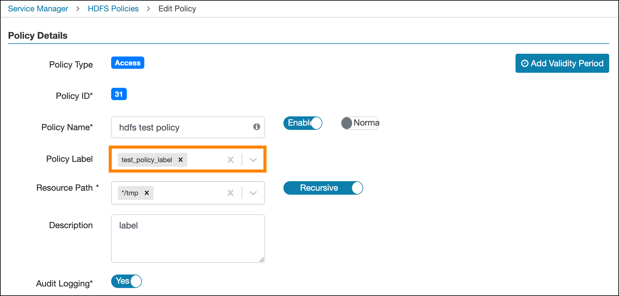Figure 1. Filtering Resource-based policies for HDFS service by label