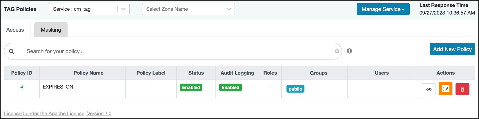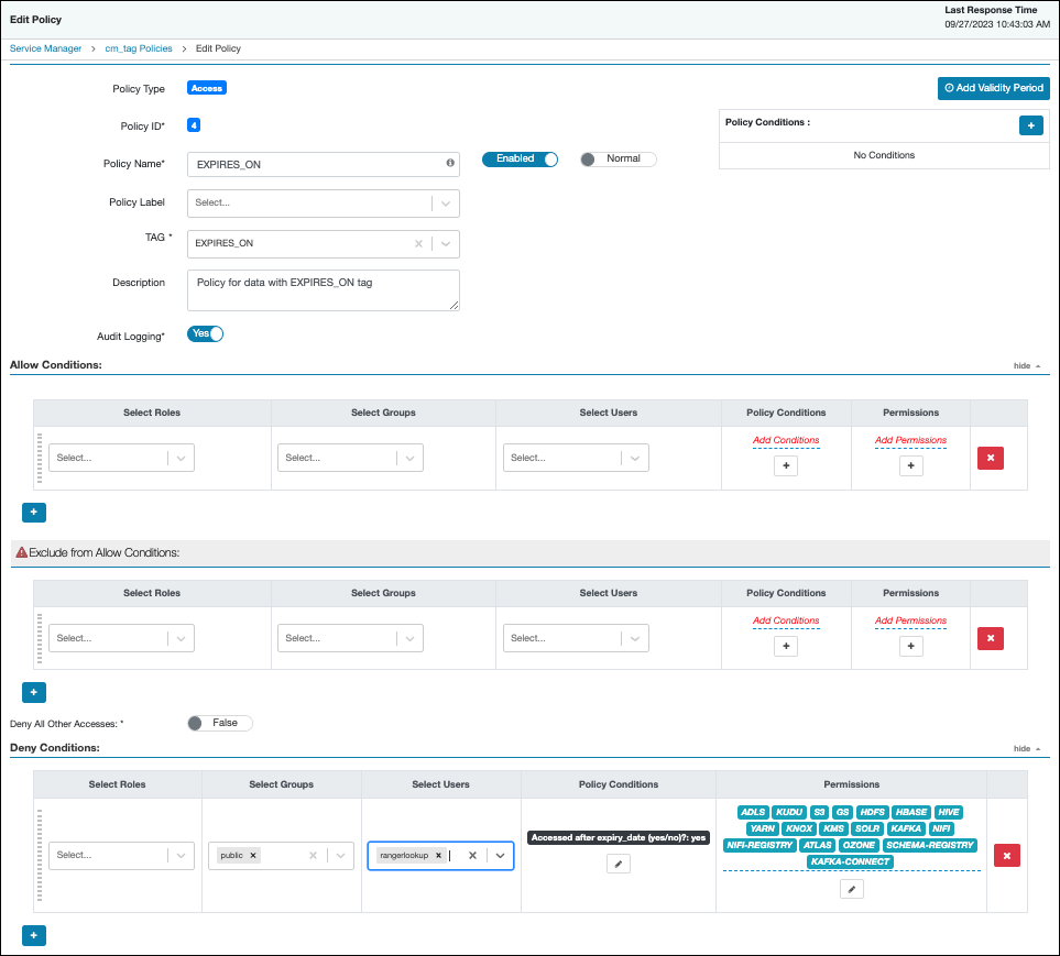 An EXPIRES_ON tag-based policy is created automatically when a tag service instance created. This default policy denies access to objects tagged with EXPIRES_ON after the expiry date specified in the Atlas tag attribute. You can use the following steps to review the default EXPIRES_ON policy.