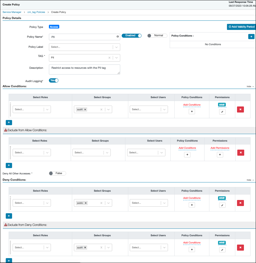 Table 1. Policy Details Field Description Policy Type Set to Access by default. Policy Name PII TAG PII Audit Logging YES Description Restrict access to resources with the PII tag. Table 2. Allow Conditions Label