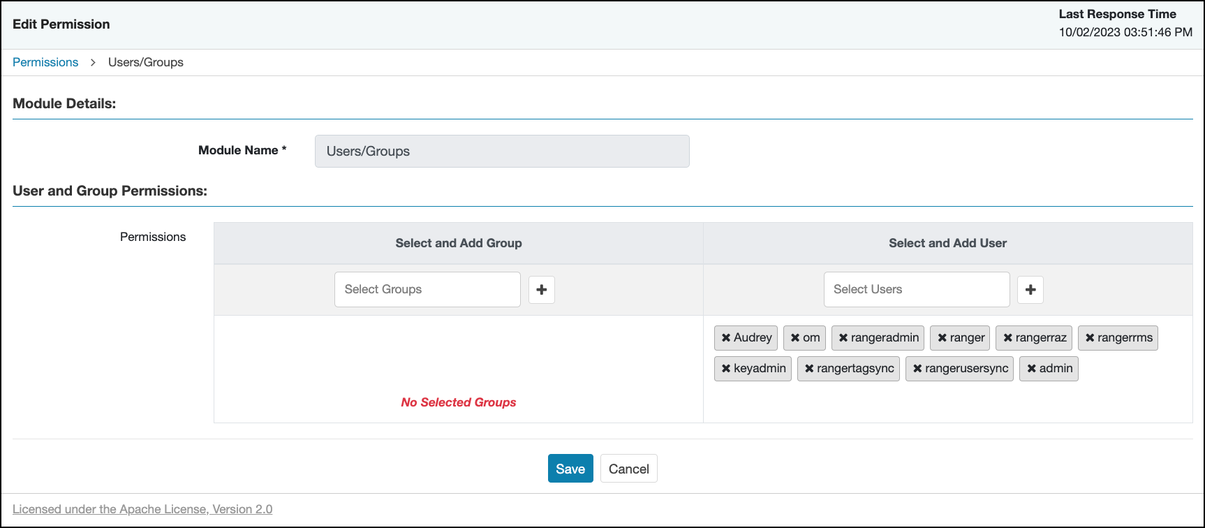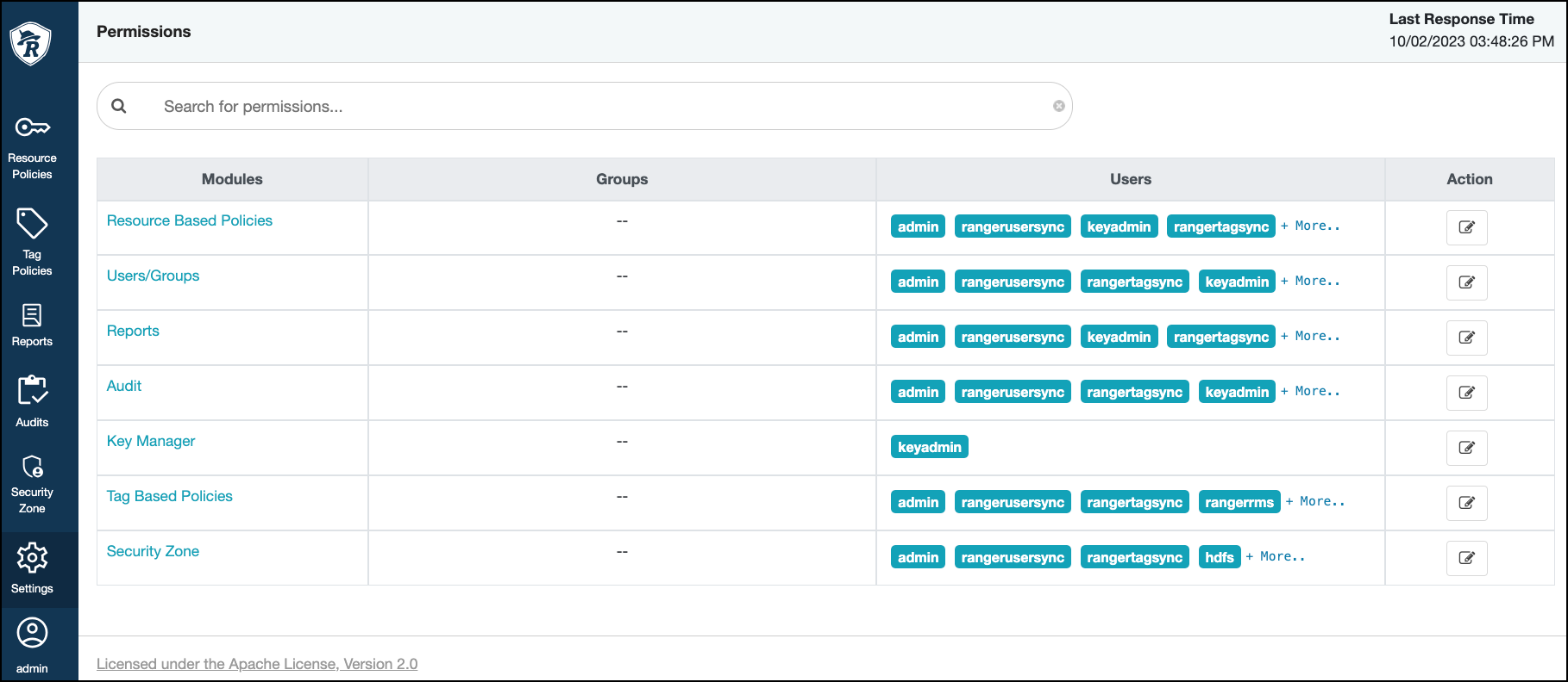 Permissions displays the Ranger Admin Web UI modules and users that