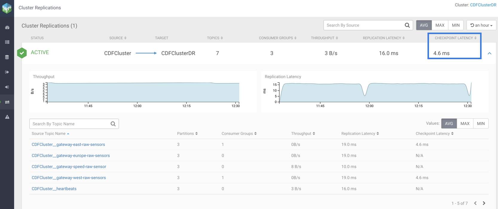 In the image, you can see the average checkpoint latency for the CDFCluster to CDFClusterDR