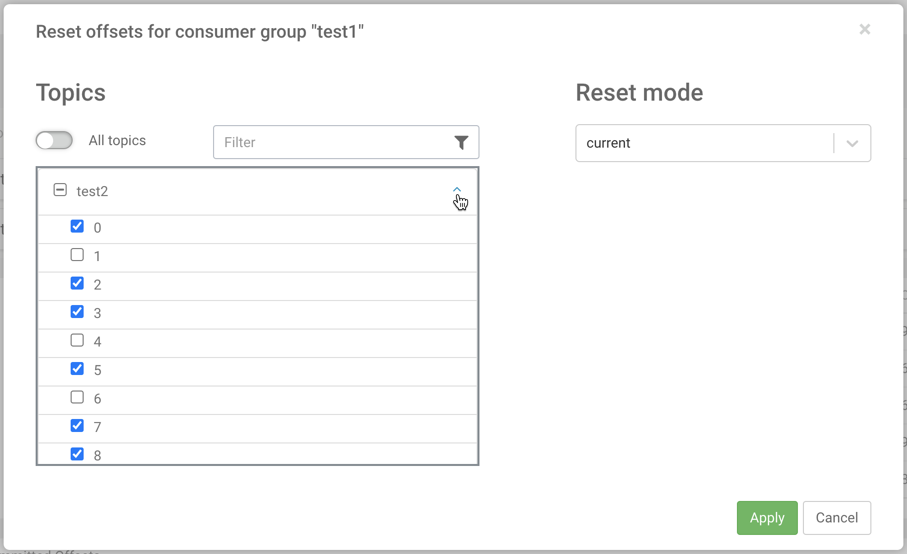 You can use the arrow beside each topic to display the partitions of that topic, and select partition(s) as required. You can also select all topics and all related partitions by selecting the All topics option. You can use the Filter option to find a specific topic.