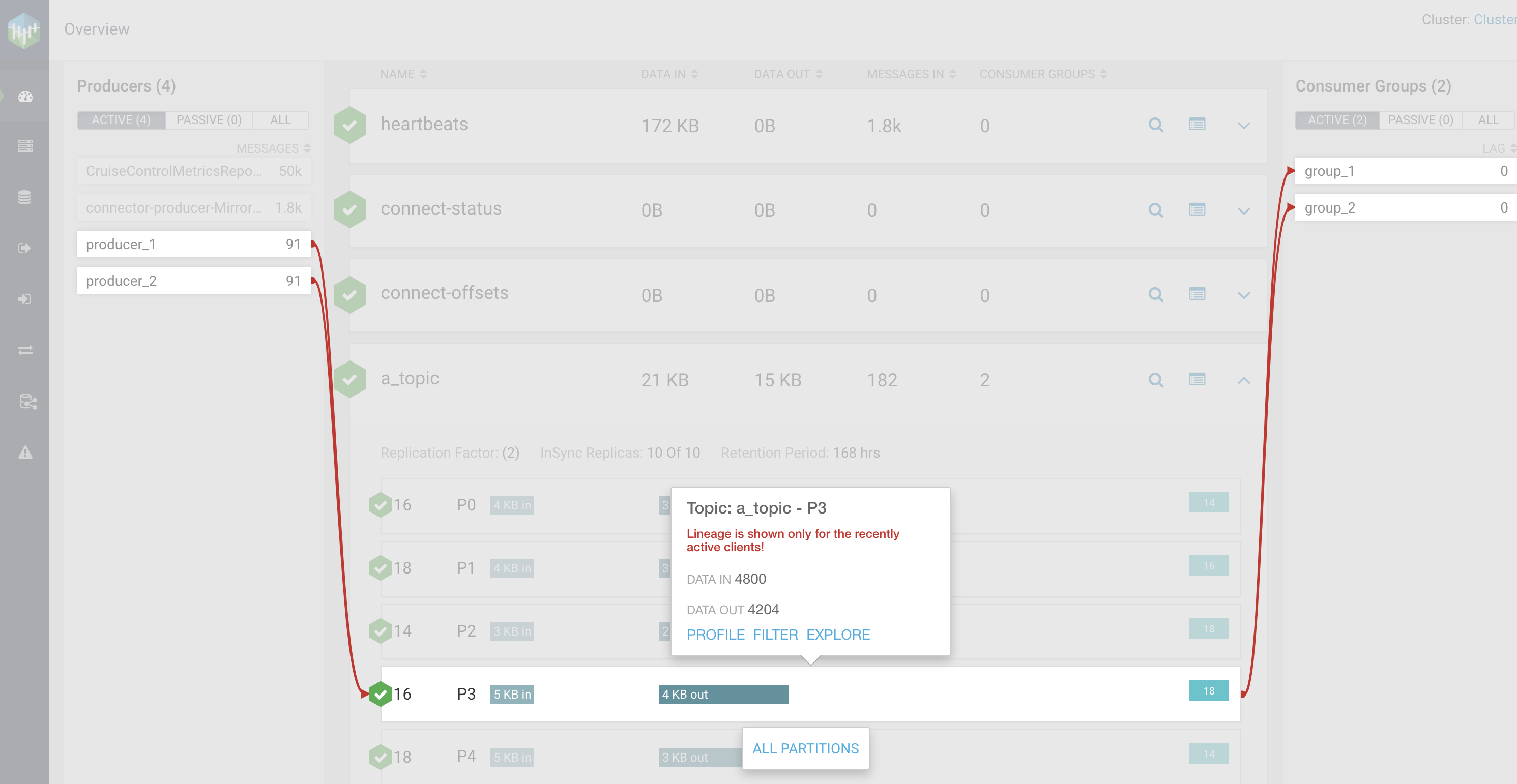 After you click P3 partition in the topic called a_topic, you can see that producer_1 and producer_2 produce to that partition, and group_1 and group_2 consume from it.