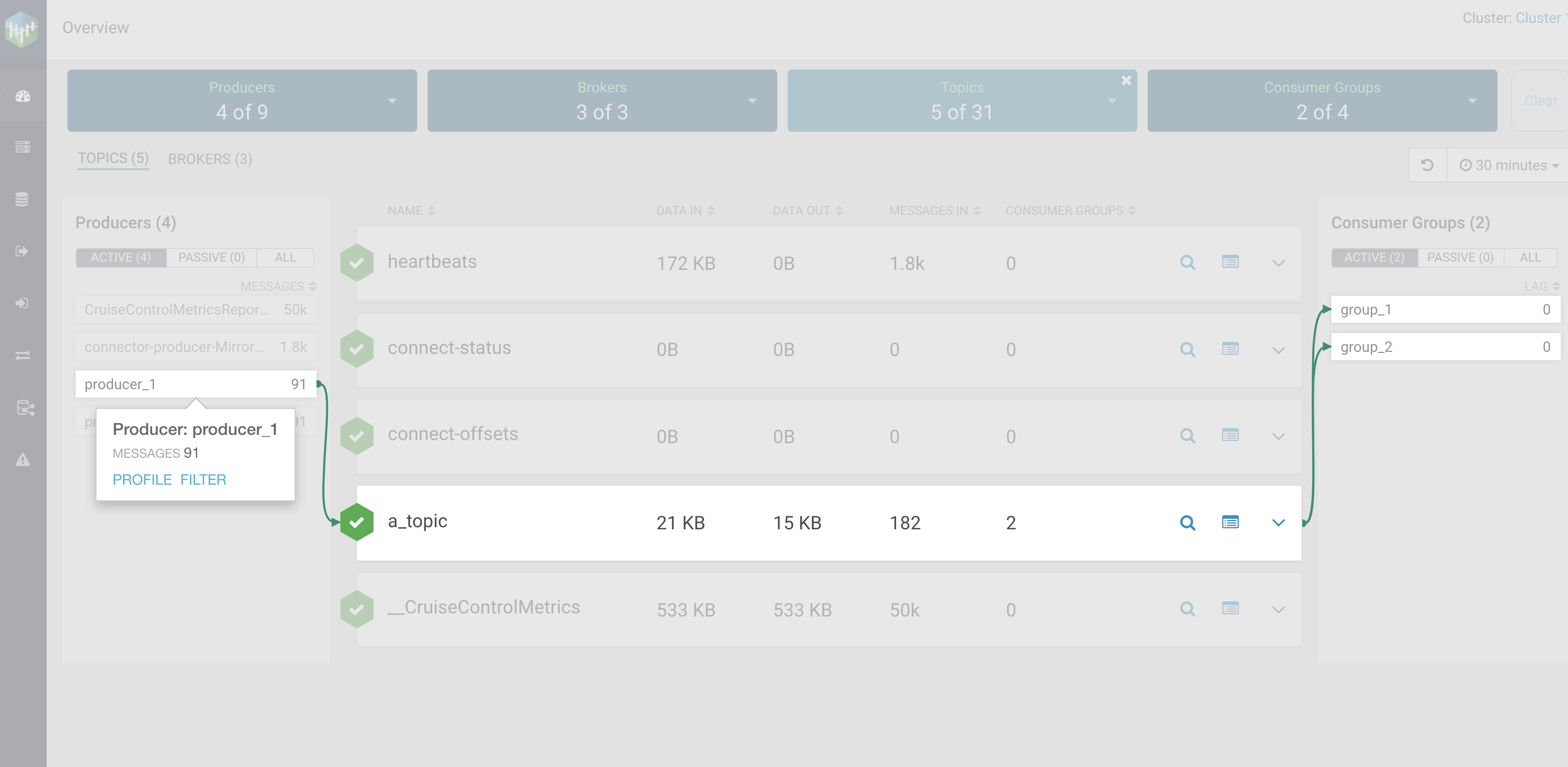 After you click group_1 consumer group, you can see that it consumes from the topic called a_topic, and that two producers produce to that topic (producer_1 and producer_2).