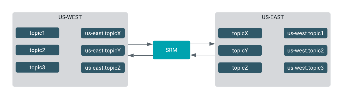 follows:srm-control topics --source us-west --target us-east --add "topic.*?"srm-control topics --source us-east --target us-west --add "topic.*?"These