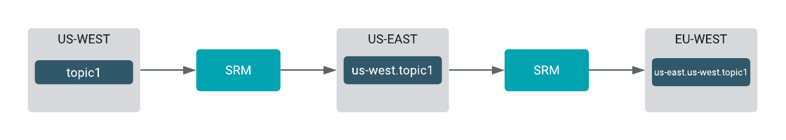 topic1topic from theus-westsource cluster creates thetopic1remote topic on the target cluster.This type of replication is also referred to as prefixless replication. This replication policy is recommended for deployments where Streams Replication Manager is used to aggregate data from multiple streaming pipelines. Alternatively, this replication policy can also be used if the deployment requires MirrorMaker1 (MM1) compatible replication.