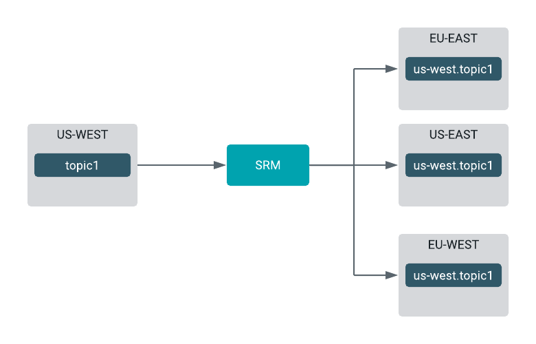 example:srm-control topics --source us-west --target us-east --add topic1, topic2, topic3srm-control topics --source us-east --target us-west --add topicX, topicY, topicZFan-in and fan-out replication flows