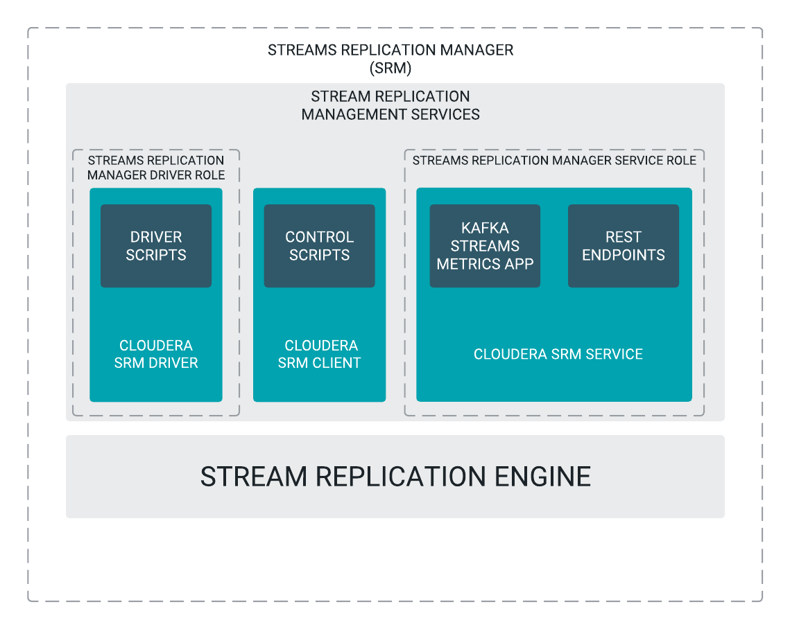 Streams Replication Manager is an enterprise-grade replication solution that enables fault tolerant, scalable and robust cross-cluster Kafka topic replication. Streams Replication Manager provides the ability to dynamically change configurations and keeps the topic properties in sync across clusters at high performance. Streams Replication Manager also delivers custom extensions that facilitate installation, management and monitoring making Streams Replication Manager a complete replication solution that is built for mission critical workloads. Streams Replication Manager consists of two main components. The Stream Replication Engine and the Stream Replication Management Services.