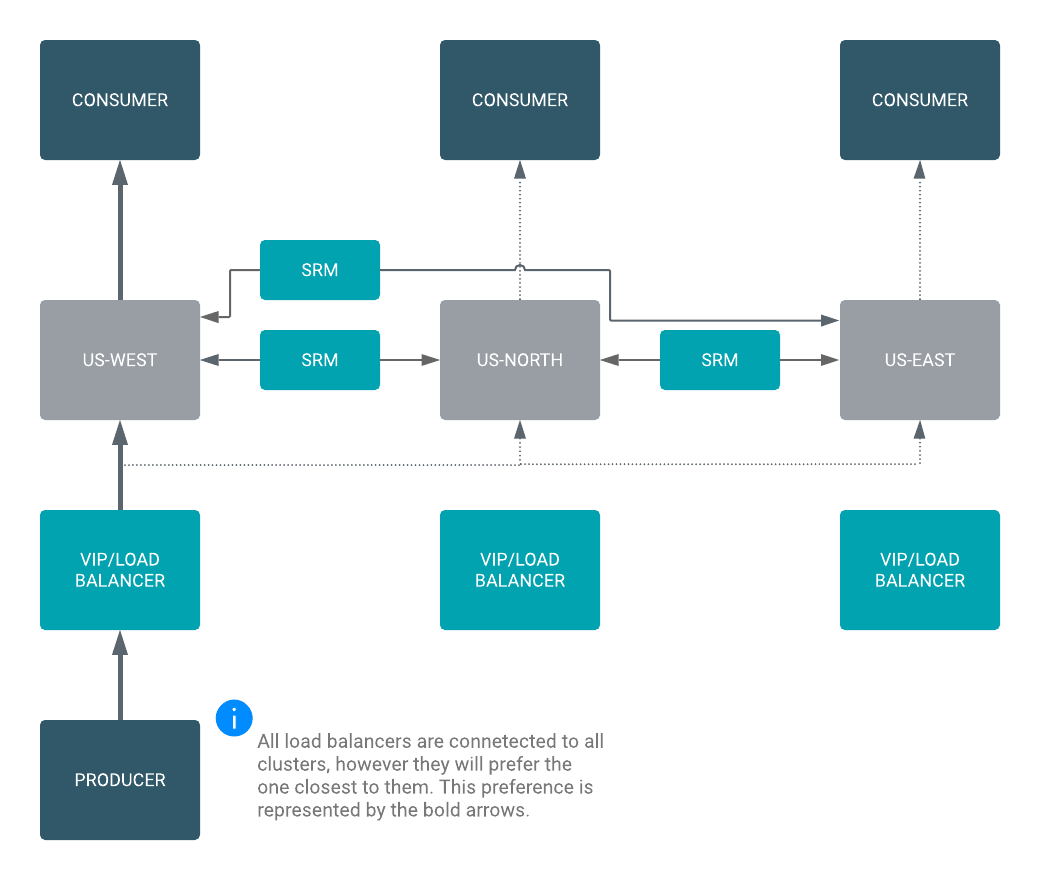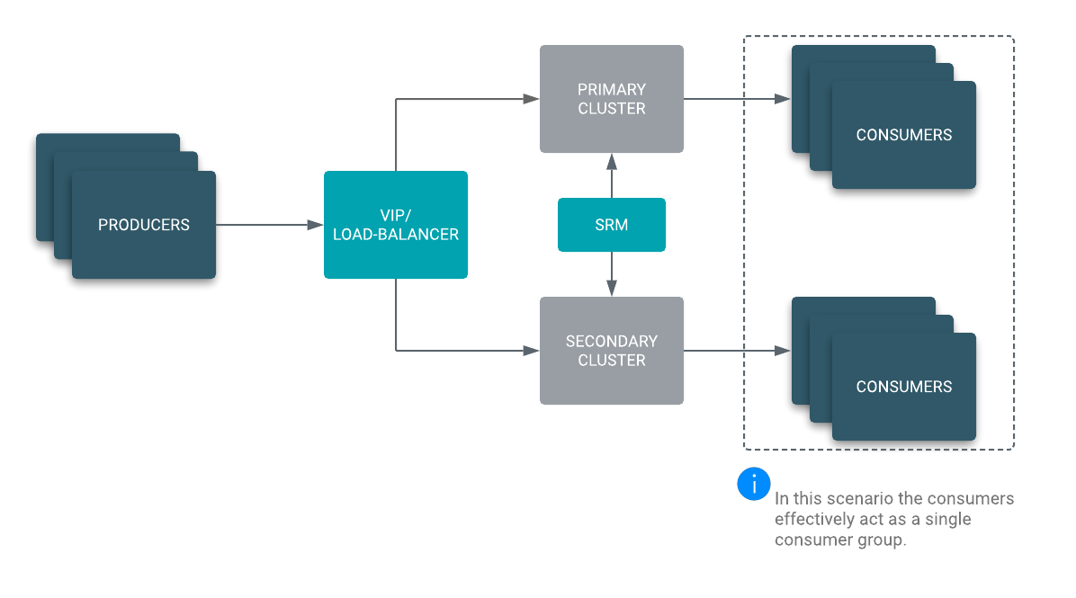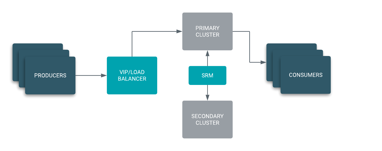 In an Active/Standby scenario, you set up two Kafka clusters and configure Streams Replication Manager to replicate topics bidirectionally between both clusters. A VIP or load balancer directs your producers to ingest messages into the active cluster from which consumer groups are reading from.