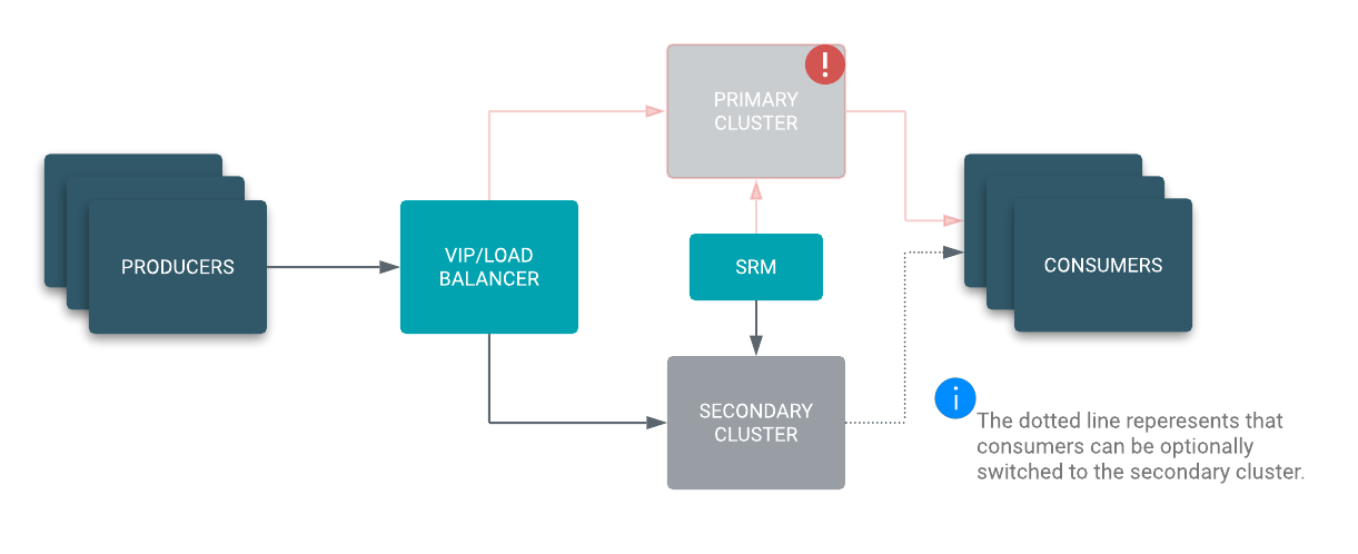 In case of a disaster, the VIP or load balancer directs the producers to the secondary cluster. You can easily migrate your consumer groups to start reading from the secondary cluster or simply wait until the primary cluster is restored if the resulting consumer lag is acceptable for your use case.