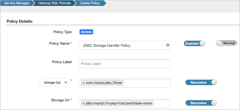 Alternatively, you can use the wildcard asterisk in the Storage Url format when you define the policy, for example jdbc:mysql://mysql-host:port/* as shown below. In the query, you then use the hive.sql.query table property to denote an arbitrary SQL query: