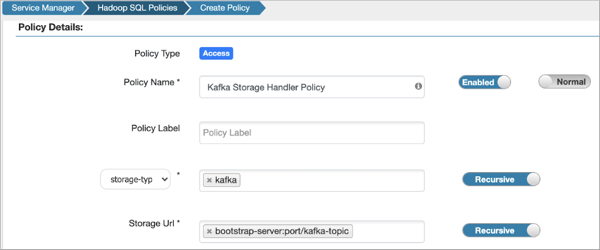 The policy definition sets the kafka storage-type and storage Url format bootstrap-server:port/kafka-topic.