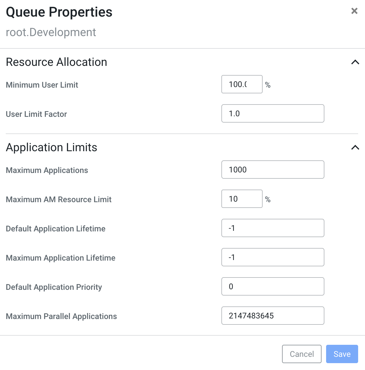 In Cloudera Manager, you can use the Queue Properties to view and configure the queue properties.