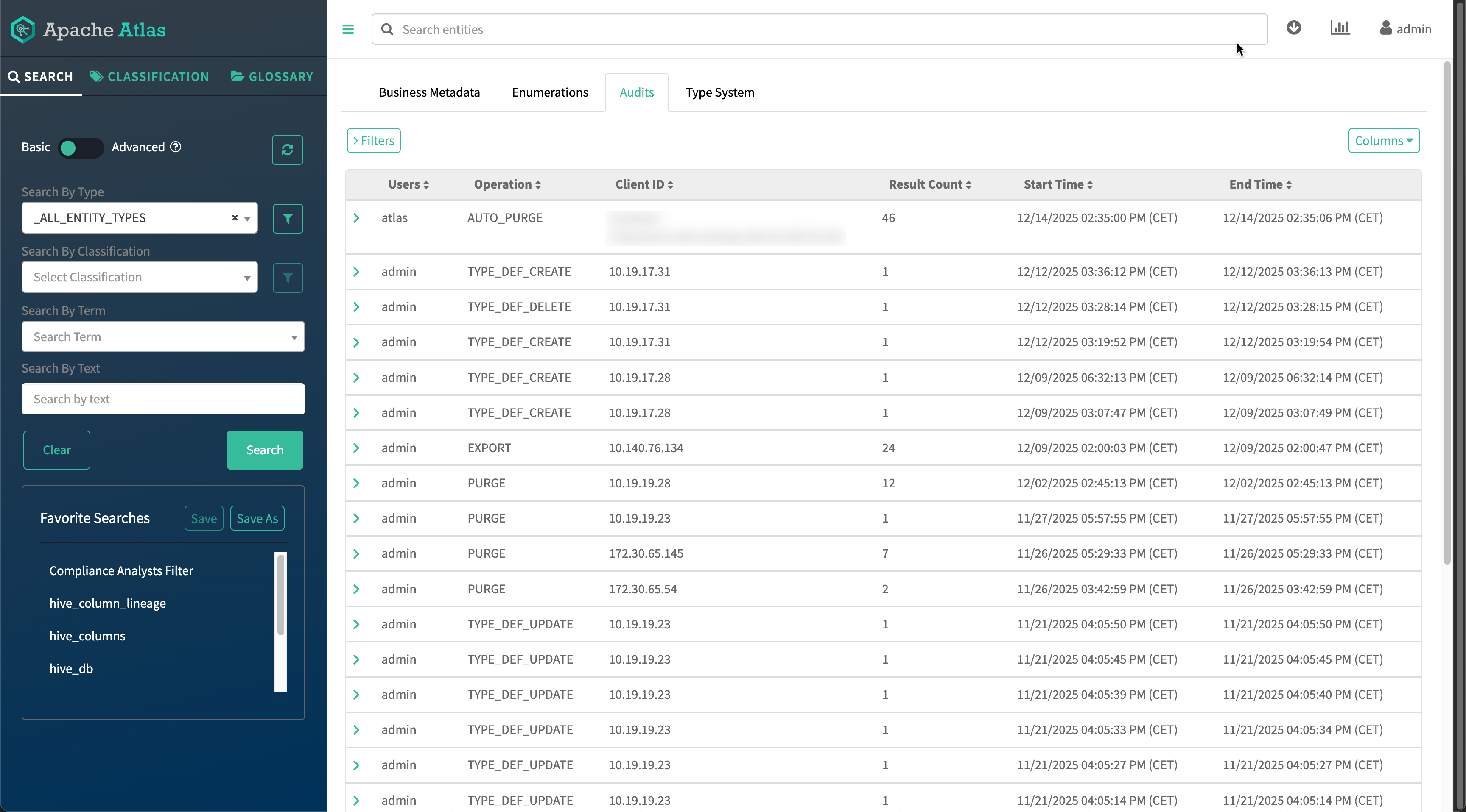 As an Atlas administrator you can view the audit operations listed in the Audits tab in the Atlas user interface. The audit data is captured implicitly by Atlas for various operations.