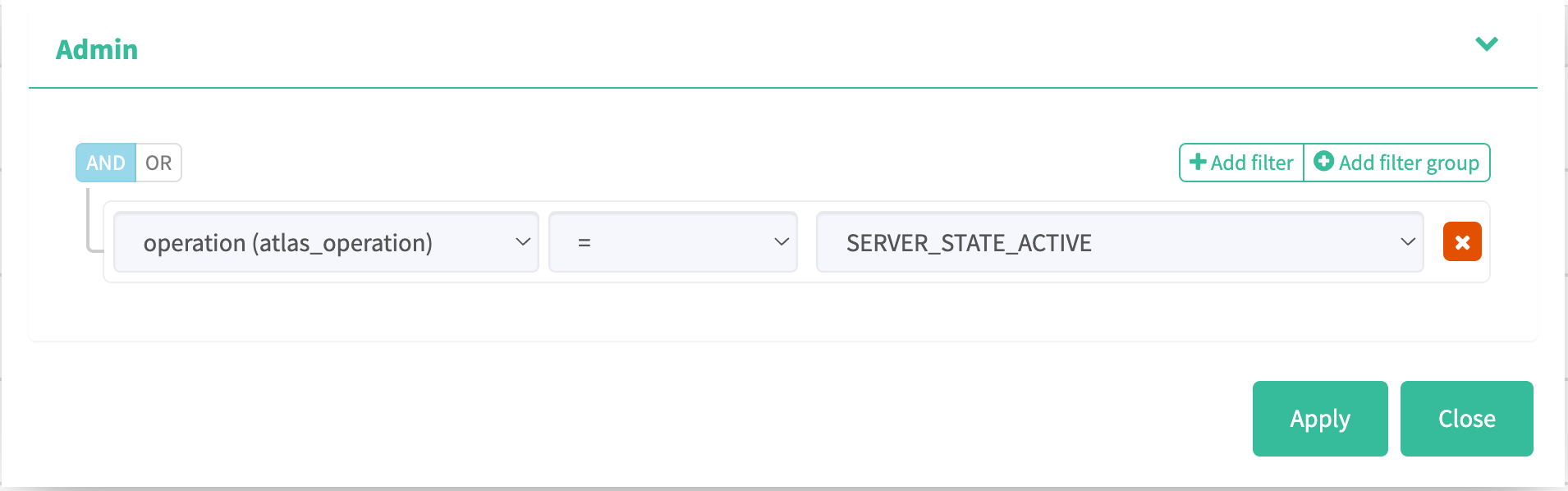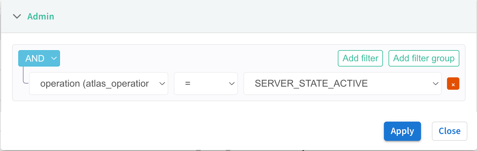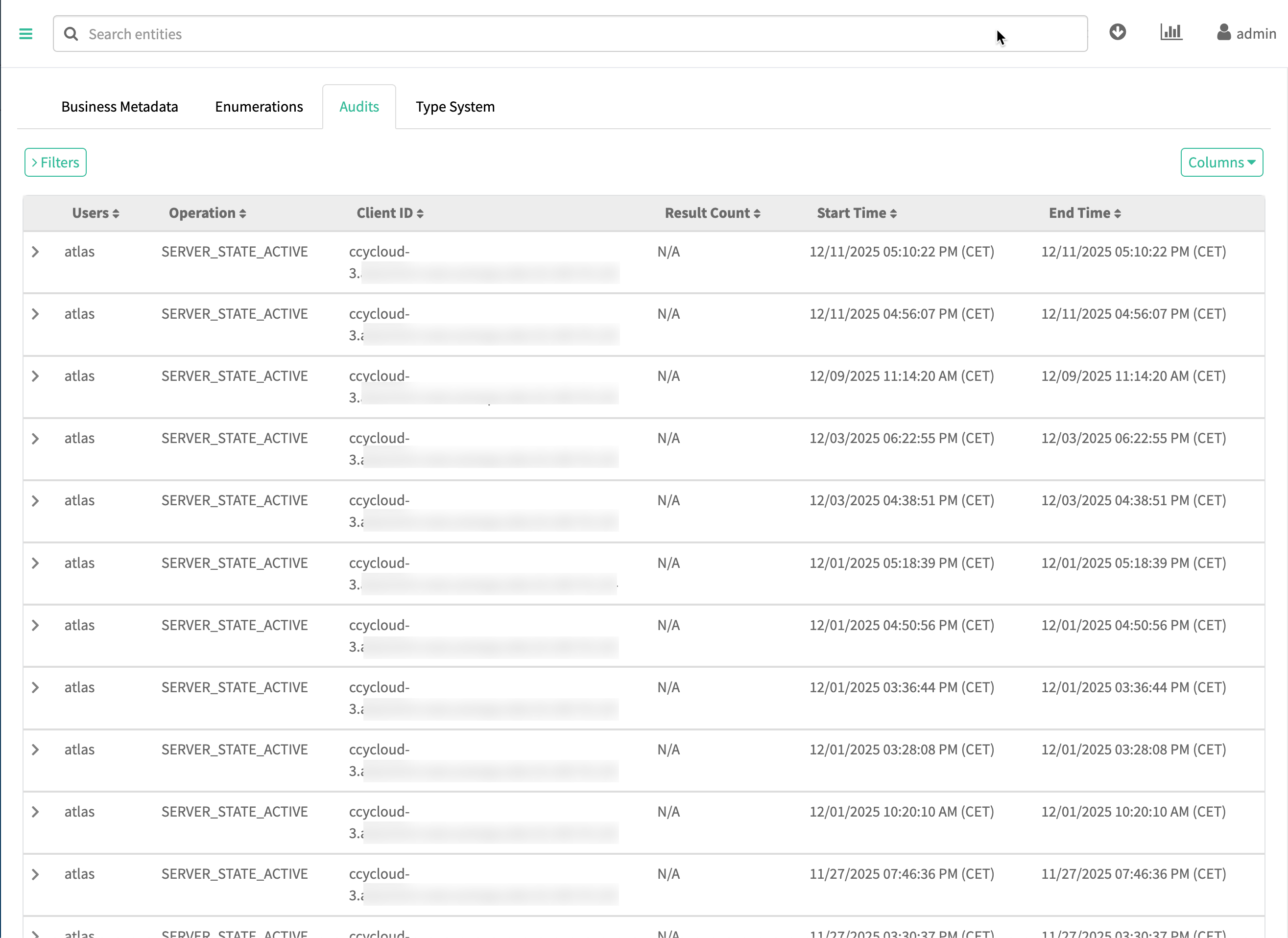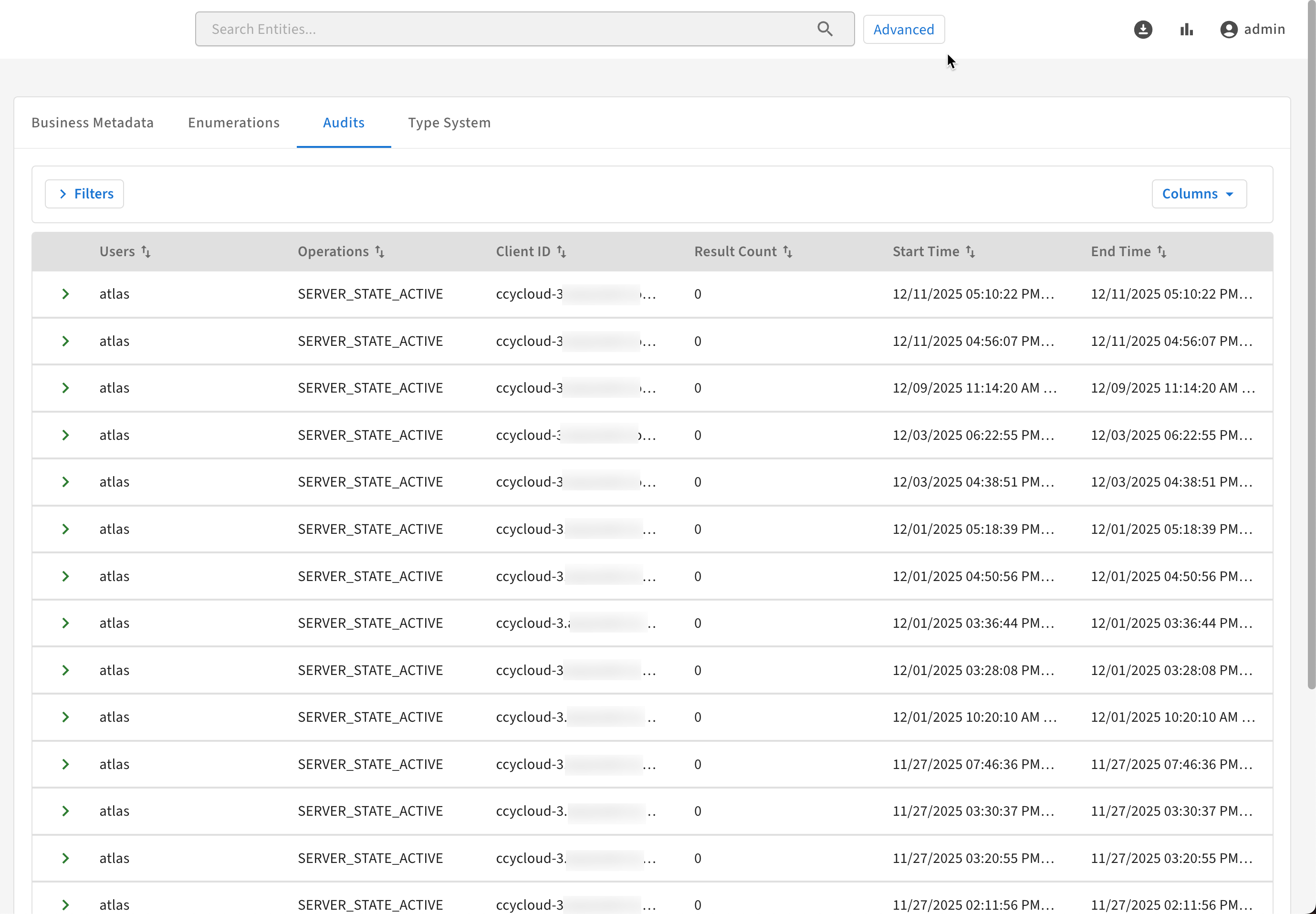 When the Apache Atlas server is started, an audit entry is logged. Also, when the server is started in the Active mode using High Availability (HA), an audit entry is logged. For more information, see About Atlas High Availability.