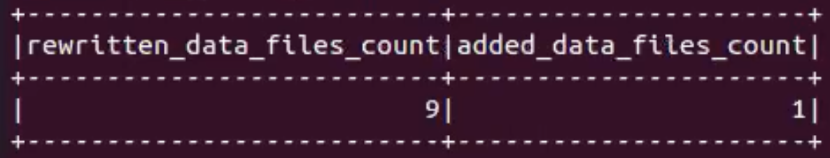 The count for the number of rewritten data files is compacted from a total count of 9 to 1.