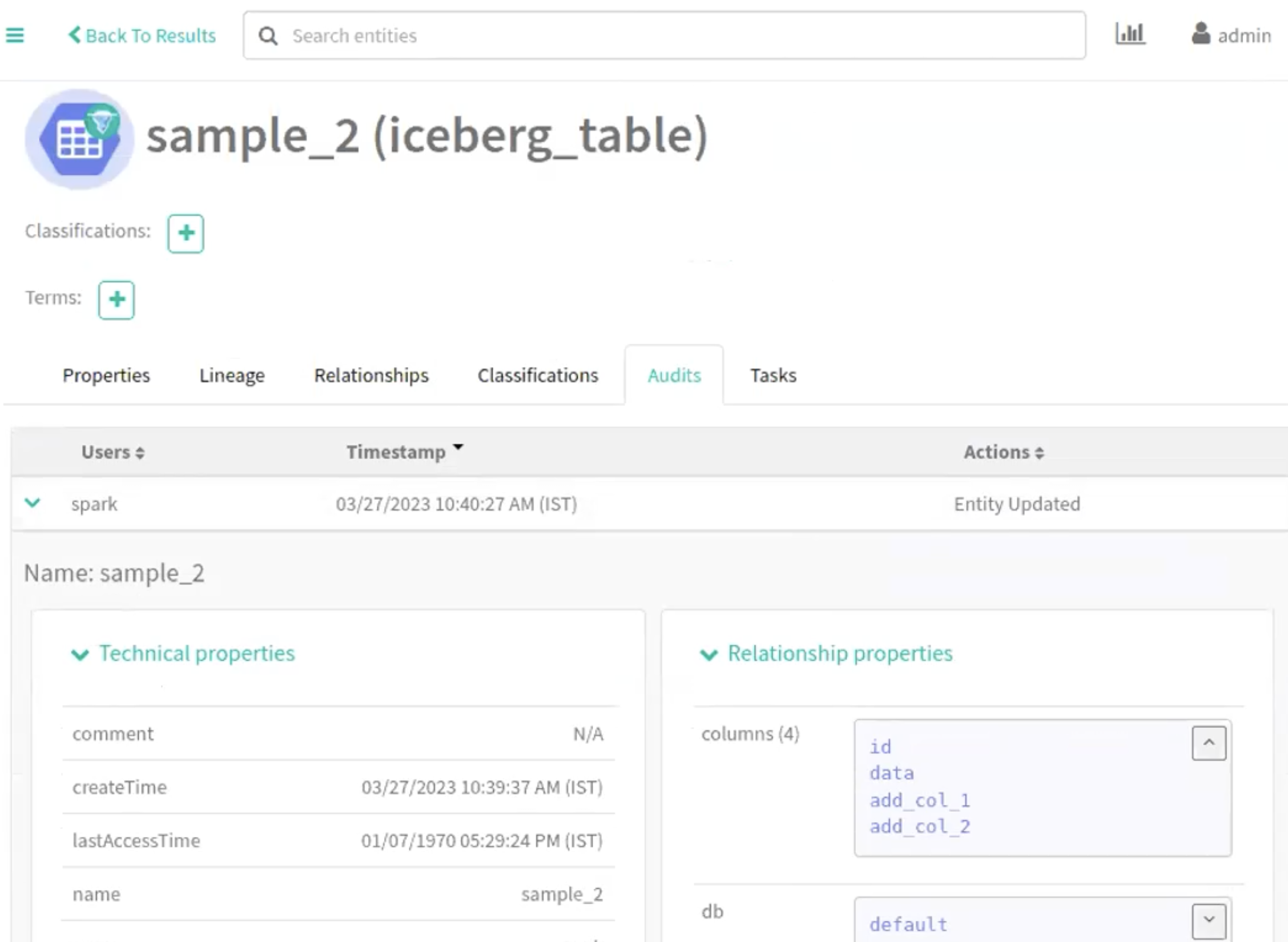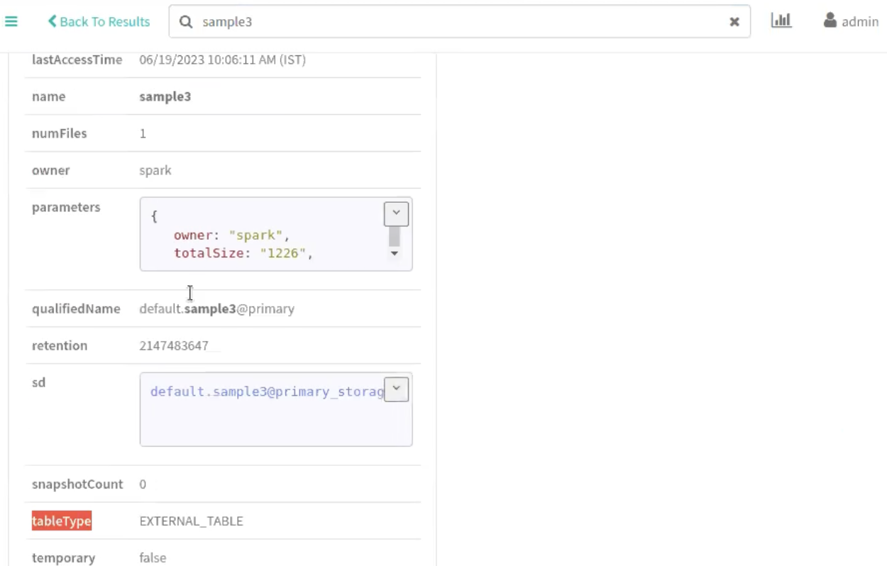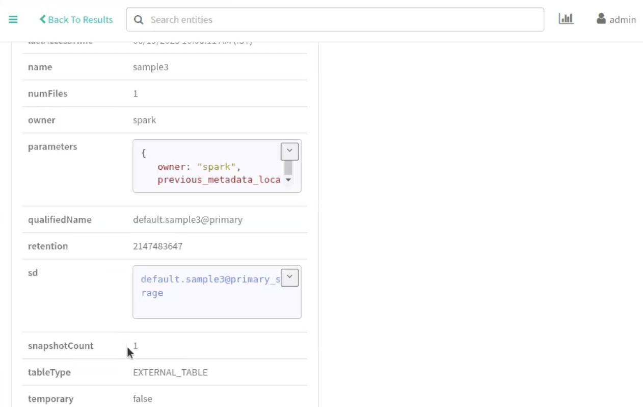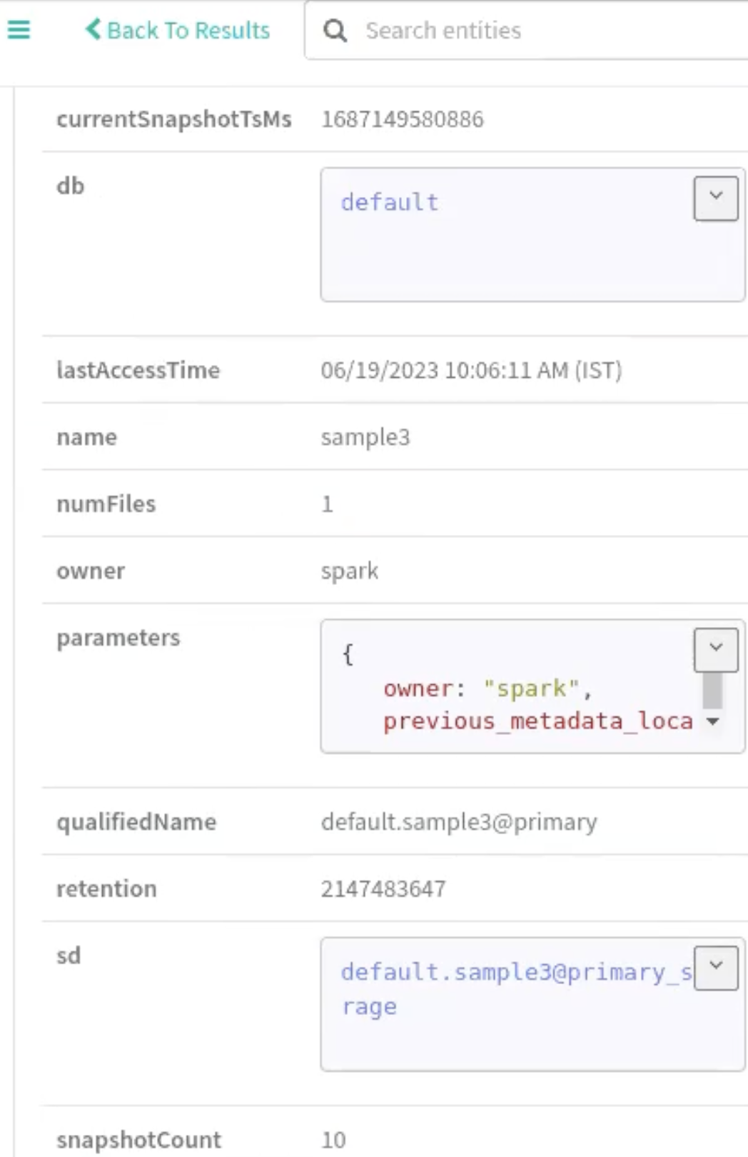 Run the following command to display relevant snapshot table parameters as attributes in Atlas. For example: Existing snapshot ID, current snapshot timestamp, snapshot count, number of files and related attributes.