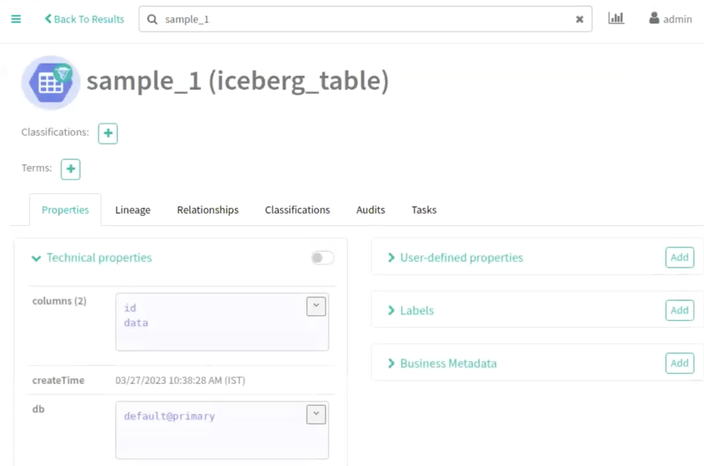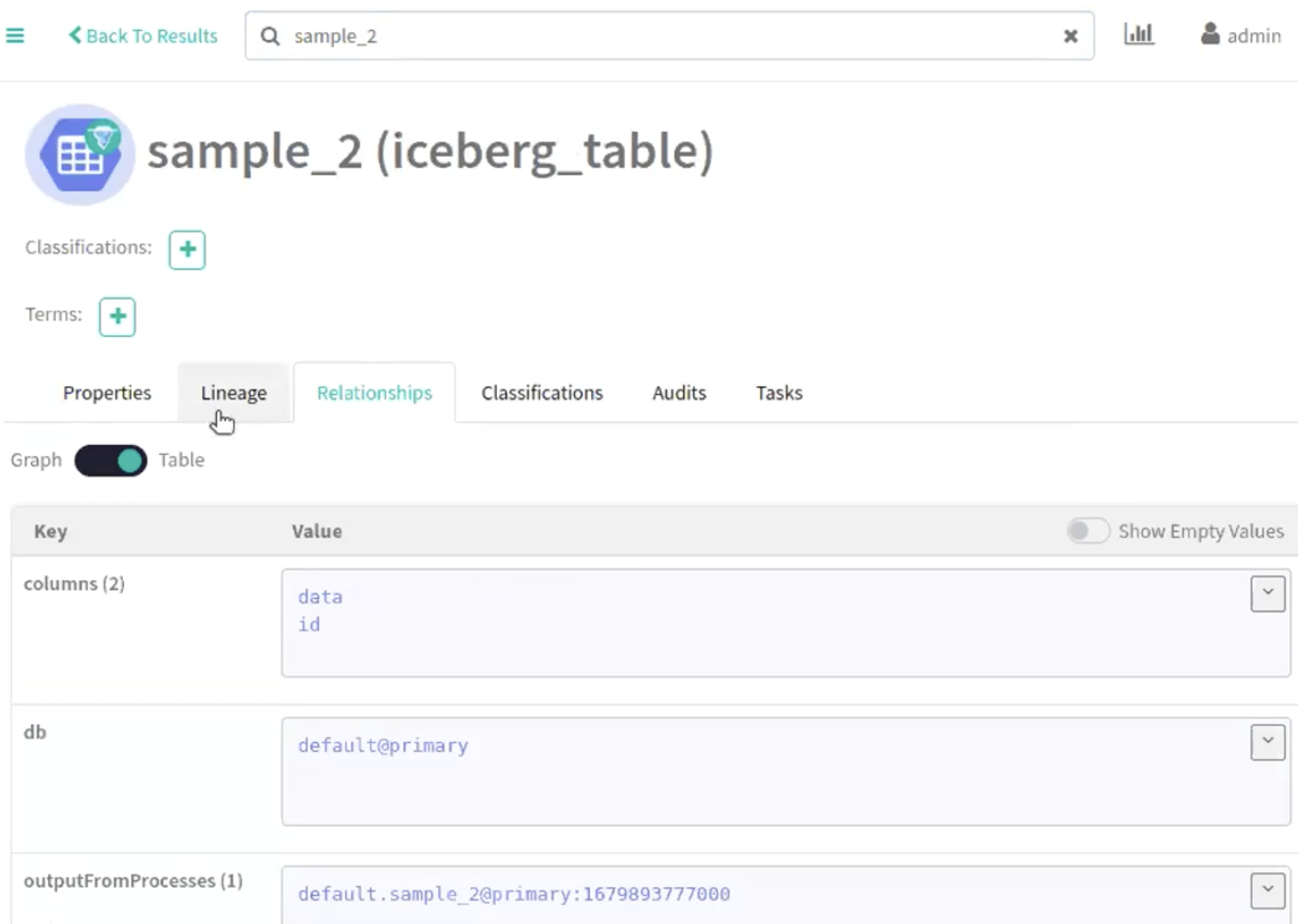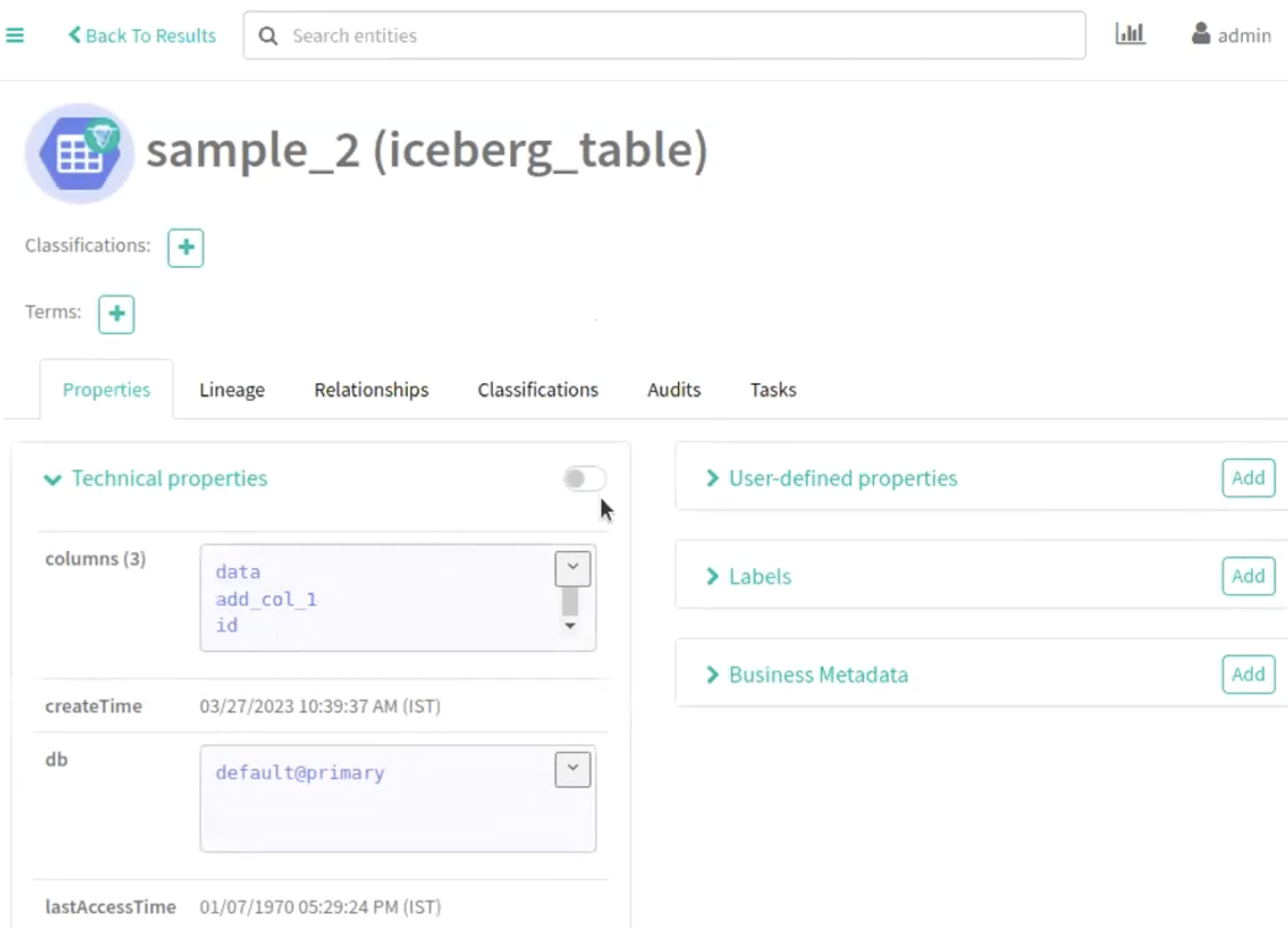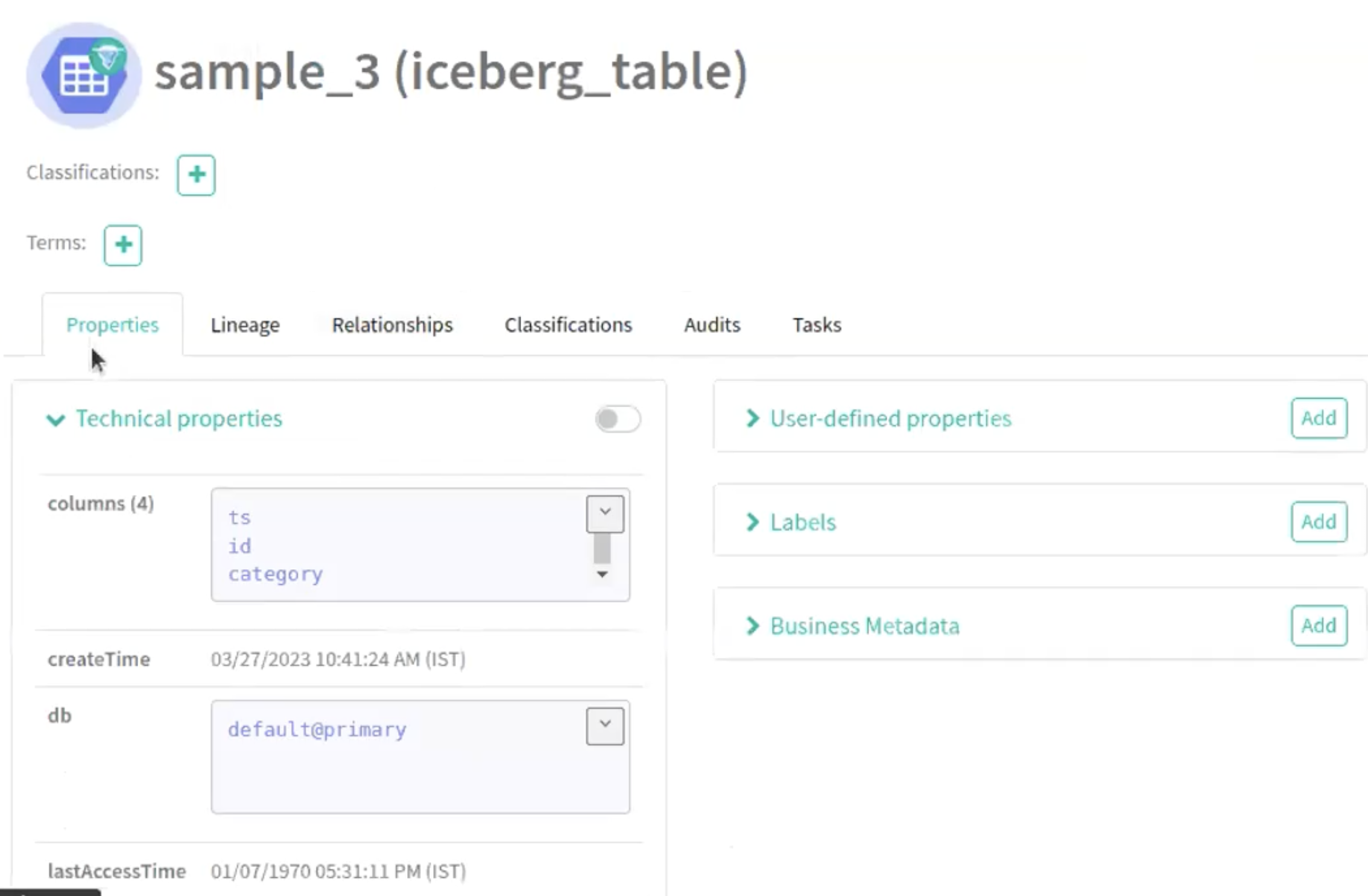 Run the following command to display relevant snapshot table parameters as attributes in Atlas. For example: Existing snapshot ID, current snapshot timestamp, snapshot count, number of files and related attributes.