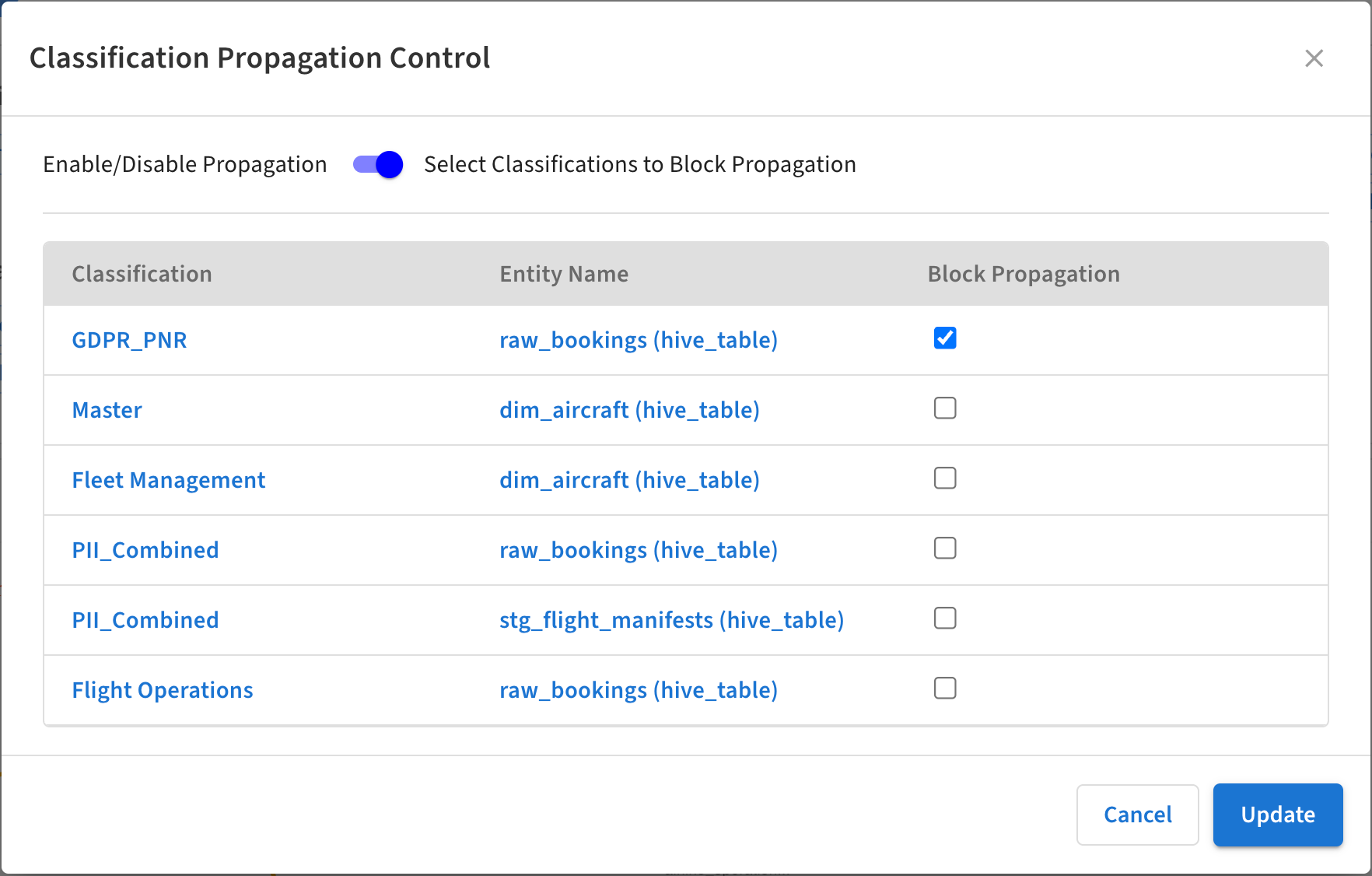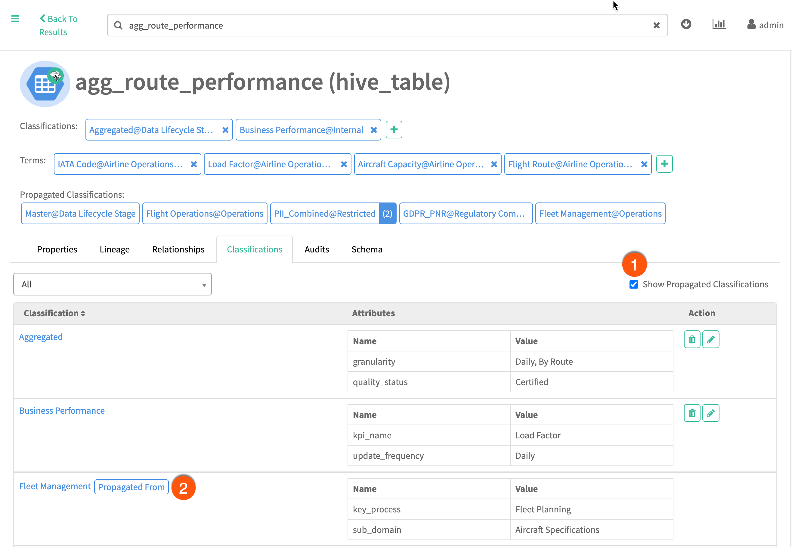 When you look at the classifications assign to an entity, you can see which classifications where originally assigned to this entity and which were propagated here through lineage. From the Classifications tab, you can do the following: