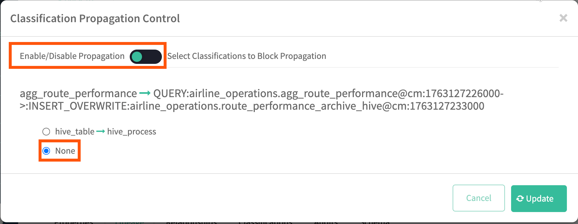 You can turn off the propagation at this point in the lineage. Classifications assigned to the entity will not propagate downstream.