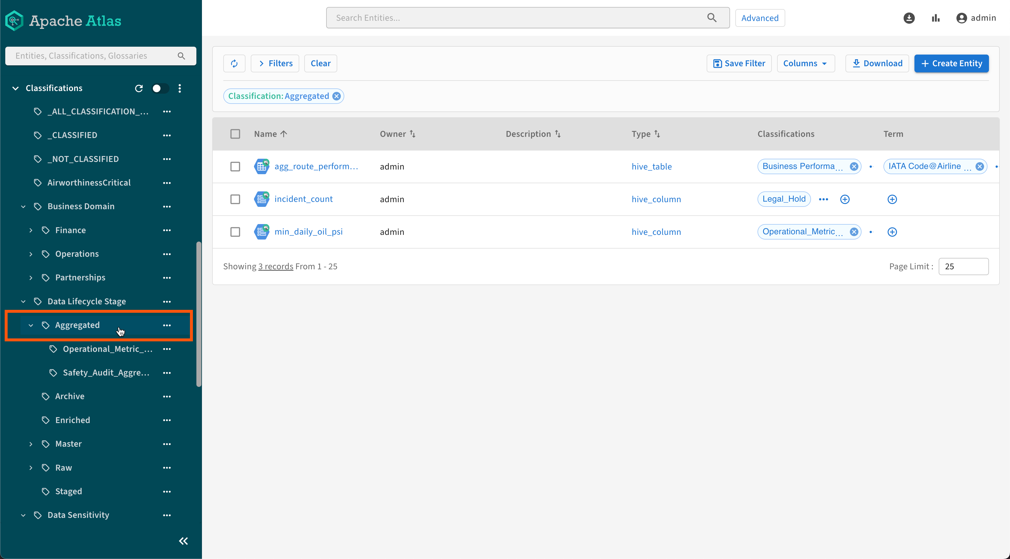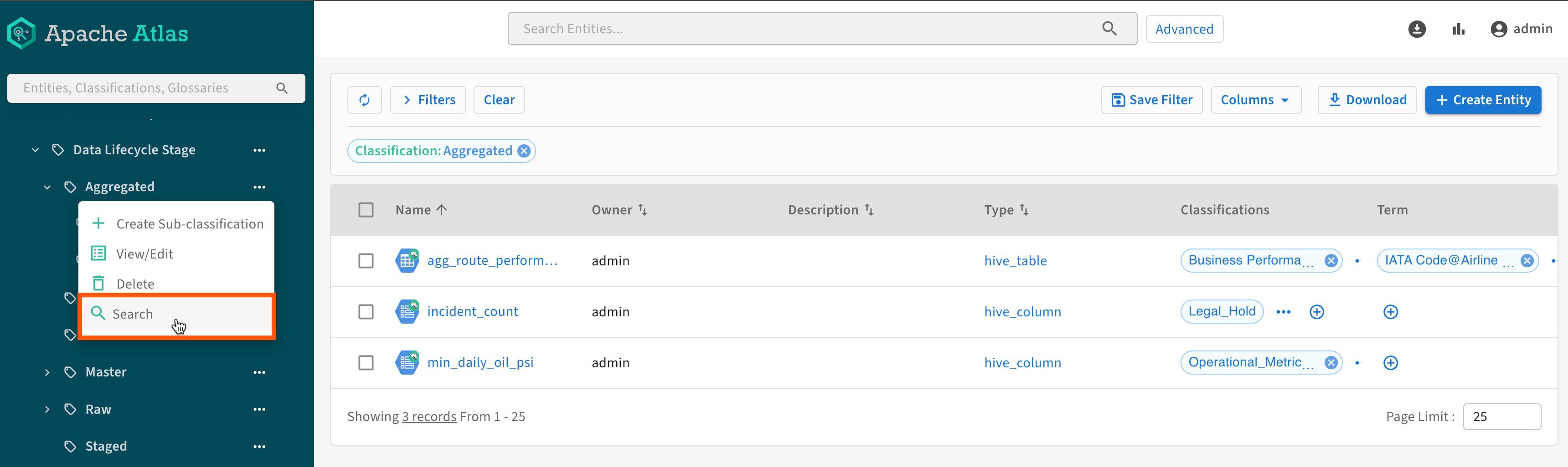The Atlas dashboard makes it easy to find entities that you've tagged with classifications. In the left navigation pane, go to the Classification and select the classification you want. You can refine your search results by adding criteria on the Search tab (Basic search).
